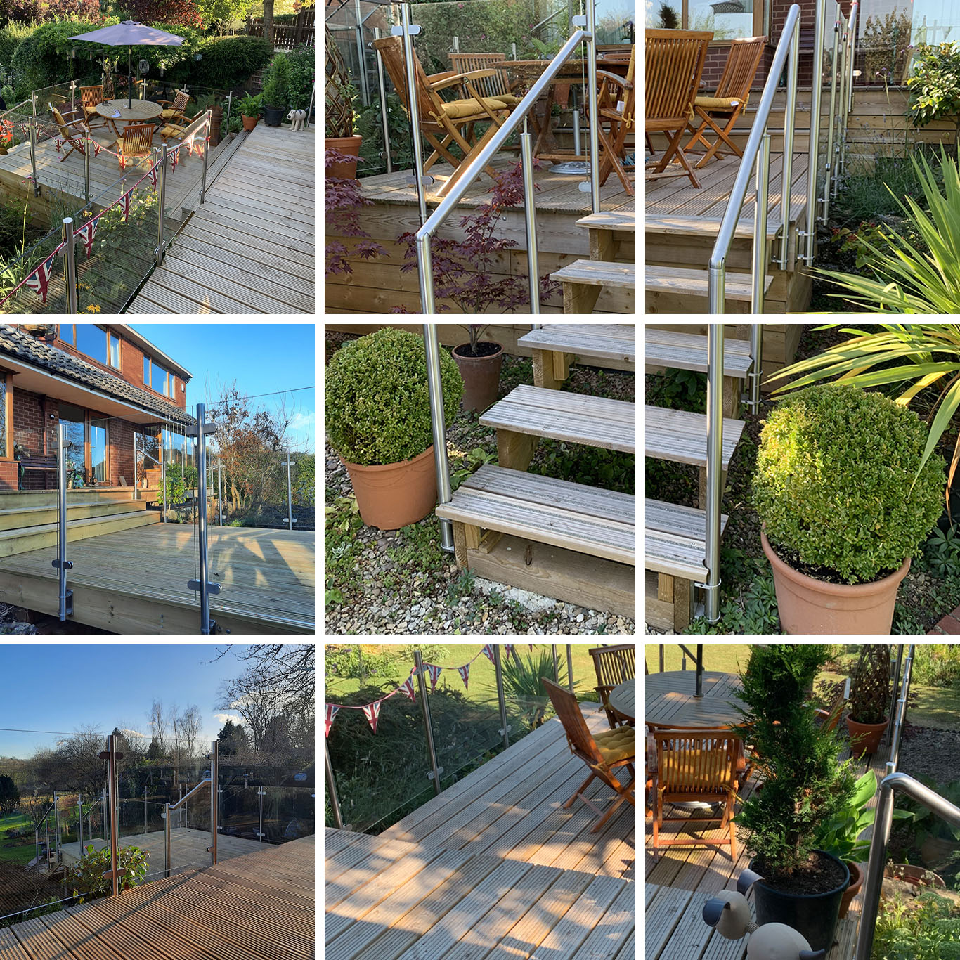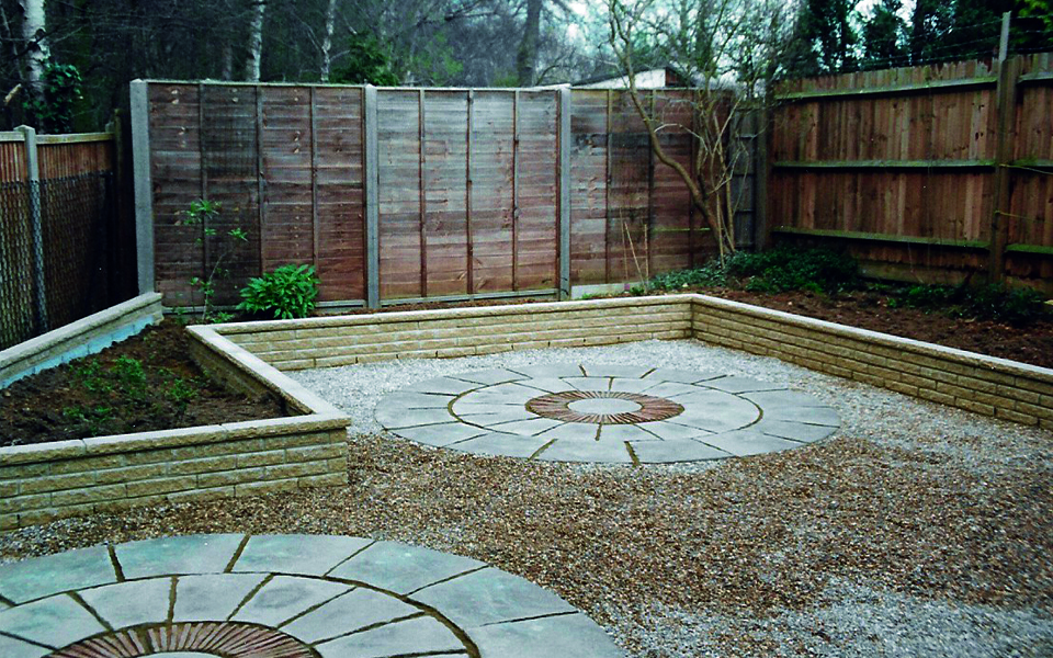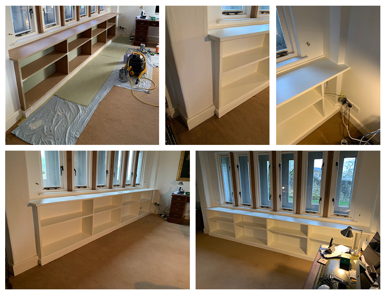 Made to measure bookcase, designed, built and fitted. Made with 25mm MDF and finished with F&B Pointing Satin. Garden circular patios, dwarf walls and stone chippings. Two level deck to rear garden.
