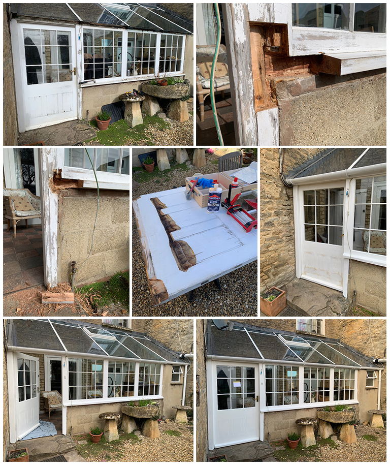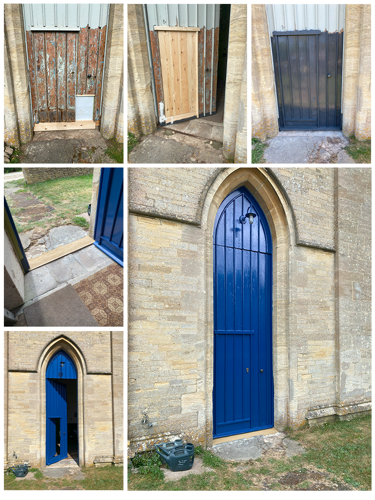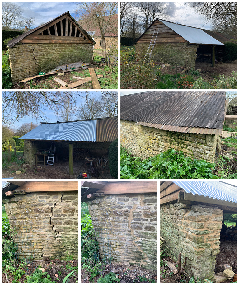 Bell Tower Door restoration at St James Church Repairs made to a garden barn. Includes new steel roofing sheets, some structural work on the timebers, and pointing with lime mortar. Restoraion work on a wooden lean-to conservatory.